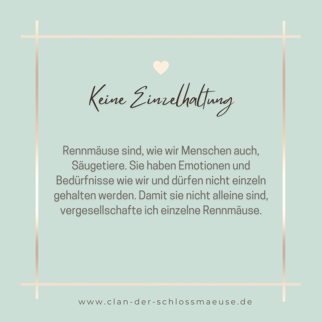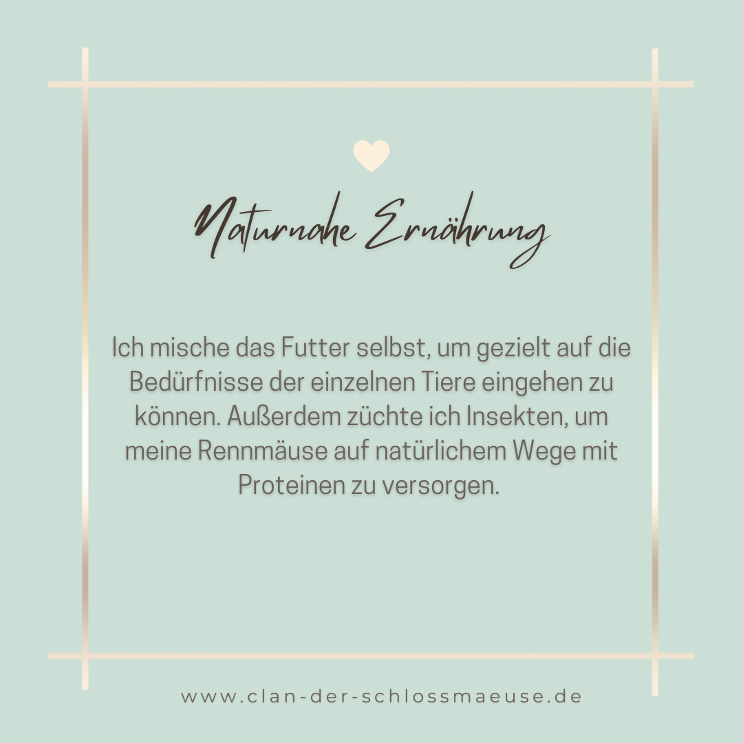 Dabei ist mir bewusst, dass ich mit der DNA der Art hantiere und lege deshalb auf das gesamte Umfeld Wert, mit dem die Rennmäuse in Kontakt kommen. Sie dürfen sich hier als Tiere mit ihren individuellen Bedürfnissen  wohlfühlen.