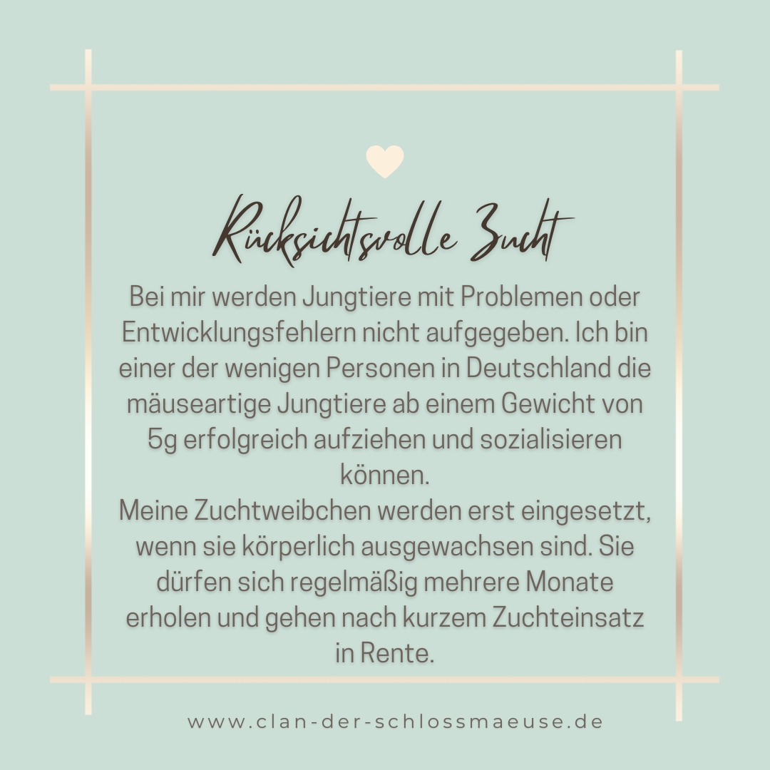 Seit 2008 züchte ich mit viel Leidenschaft mongolische Rennmäuse und stecke viel Liebe und Arbeit in meine Zucht, um mit ausgewählten Zuchttiere – die zu meinen Zuchtzielen passen – gesunden und kräftigen Nachwuchs zu haben. Dies ist eine Erhaltungszucht und keine Modezucht. Das bedeutet, hier wird nicht explizit auf Farben gezüchtet, sondern der Fokus auf langfristige Gesundheit und gesundes Sozialverhalten gelegt.
